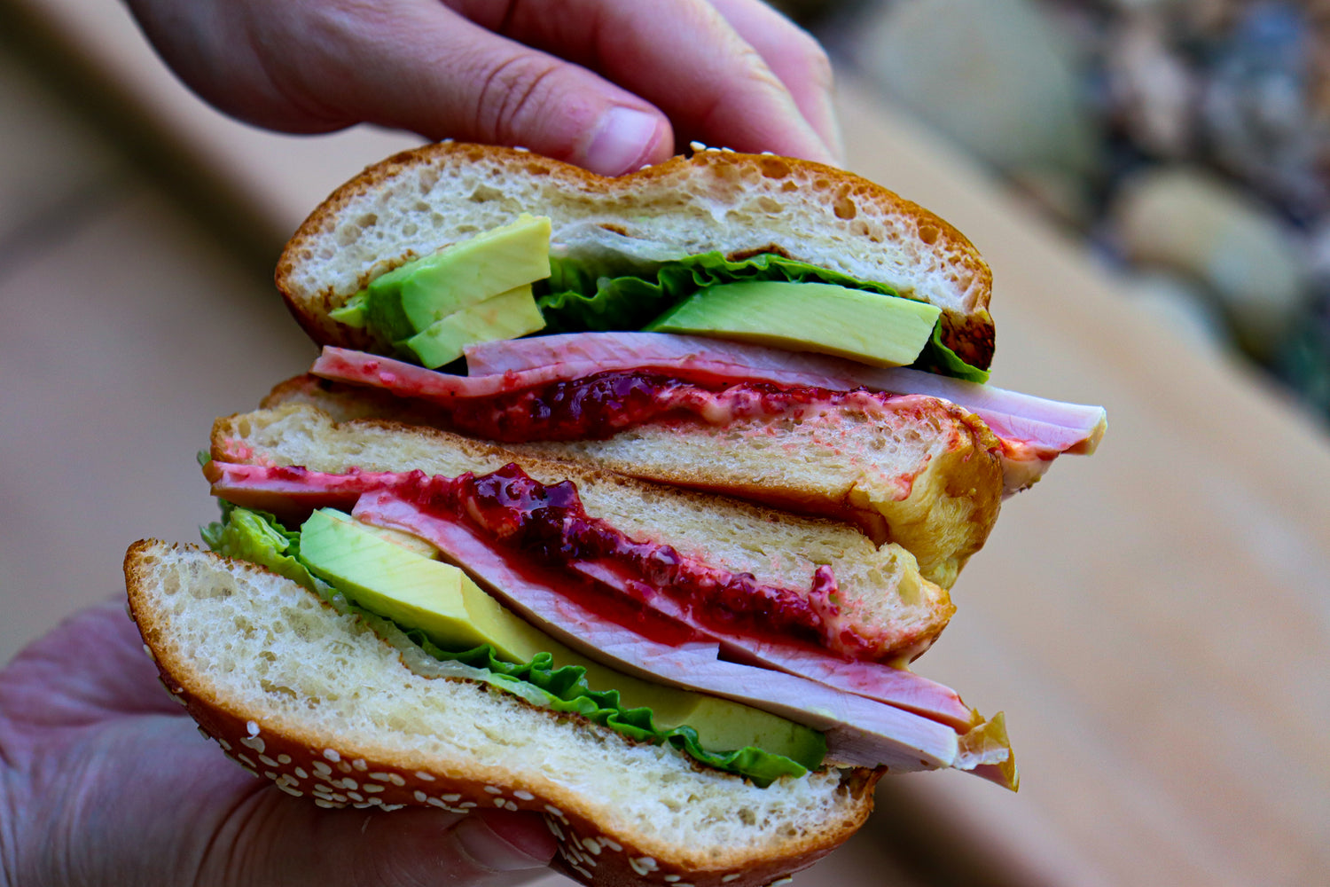 - To assemble the dynamite roll, spoon the beetroot relish onto the bottom bun to taste. Layer with the cooked ham, lettuce, and avocado. Spoon the mayo onto the bun lid and place on top.