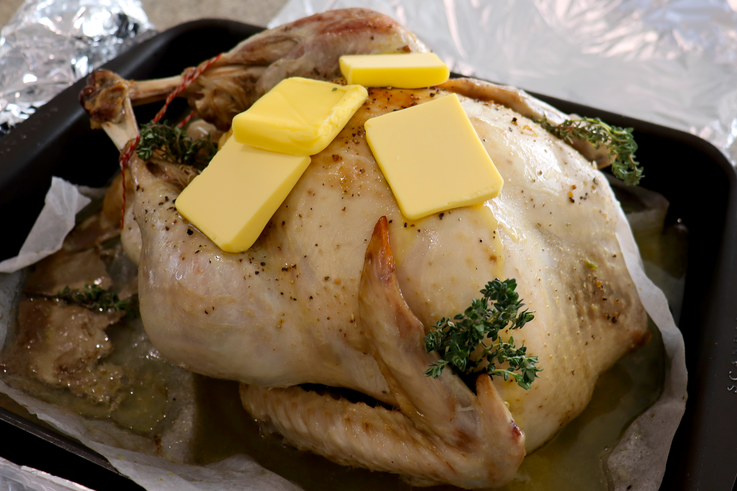 - Scatter onion wedges over base of roasting pan, place turkey on top, rub with butter and season to taste. Add wine and stock to pan, cover breasts with foil and roast, basting frequently (including breasts), for 1 hour. Add water to pan, if necessary, to prevent scorching.